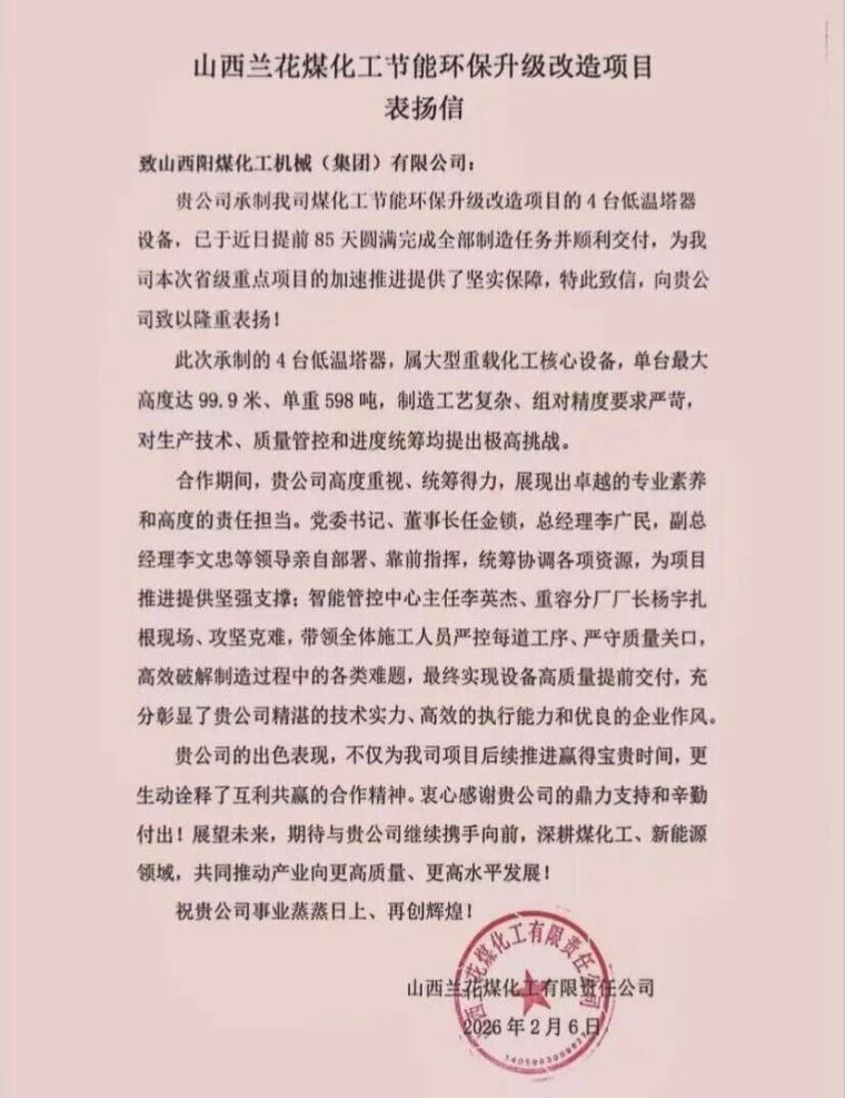 近日,潞安化机收到山西兰花煤化工节能环保升级改造项目表扬信。信中对潞安化机攻坚克难,提前85天圆满完成4台低温塔器设备制造任务并顺利交付致以表扬,并对公司团队展现出的专业素养和责任担当给予高度肯定。