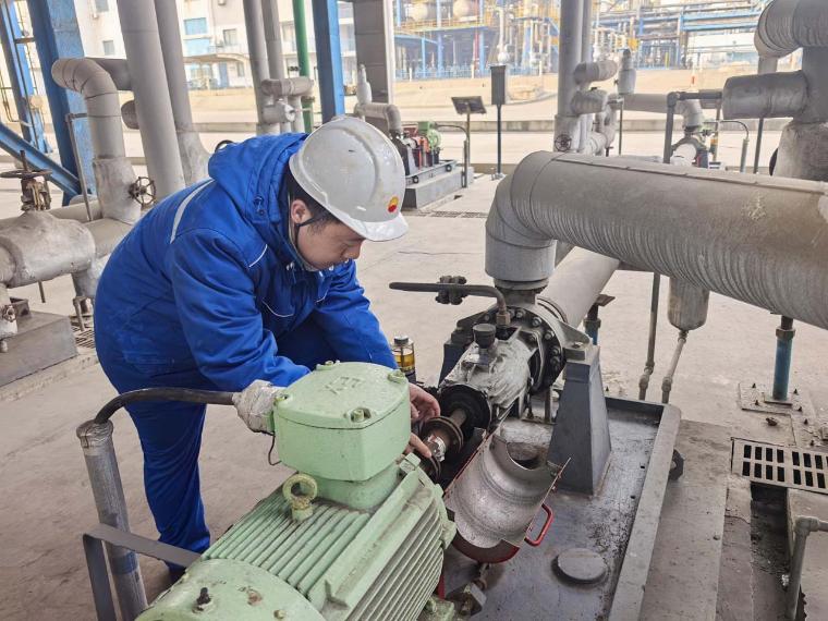 化工一部烷基化装置岗位员工对烷基化油泵进行检查。