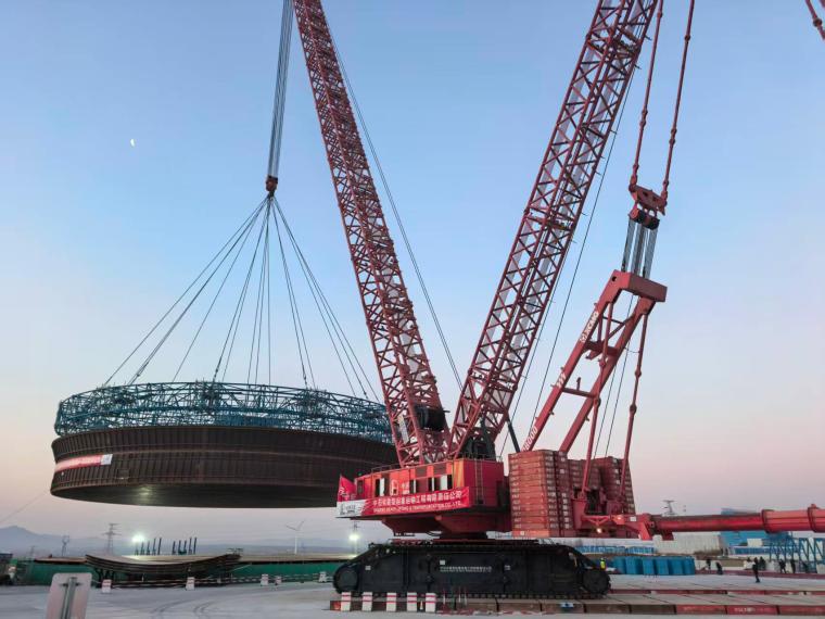 本次吊装的钢衬里模块1是石化起运公司迄今吊装直径最大的同类设备。项目团队严格执行方案,先行完成了吊装系统全面的载荷试验,彻底验证了其安全性与可靠性,为正式吊装扫清了技术障碍。1月12日上午7时整,吊装指令准时下达,XGC28000履带式起重机平稳起钩。现场采用警戒分区标准化管理,项目全体成员与各协作单位紧密配合、有序联动。经过2小时15分钟的精细、稳定操作,上午9时15分,钢衬里模块1精准降至预定基础并顺利就位,标志着本次关键吊装任务高质量完成。